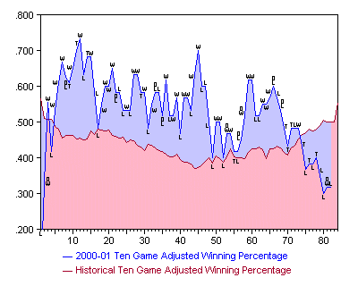 After a sub-par October, the Canucks rebounded with a strong (or at least stronger) showing in November. The arrival of Trevor Linden on November 11 coincided with the Canucks' three game winning streak which pushed them above their historical average. December was not kind to the Canucks, although a couple of wins after Christmas lifted them above their average again. In the second half of January, the Canucks rattled off six wins in a row, literally pushing their winning percentage off the chart. After six games, the Canucks came back to reality, even falling below their historical average in early March. They finished the season with a strong showing.