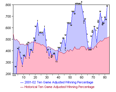 The Canucks returned to the ice after a year-long absense and started strong. A six game winning streak in October pushed them off the charts. In November, the team fell below their historical average briefly before continuing with their solid play. In early January, they struggled again, before getting back to their winning ways. In March, the team had a five game losing streak which put them below their historical average, where they stayed for most of the rest of the season.