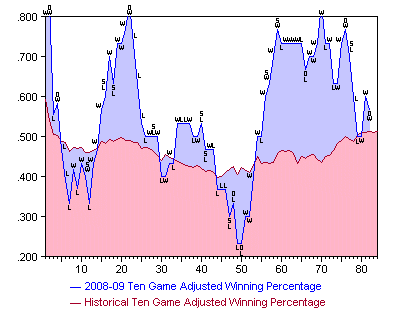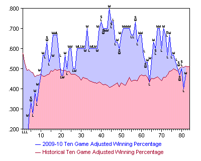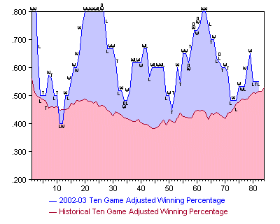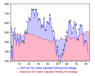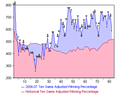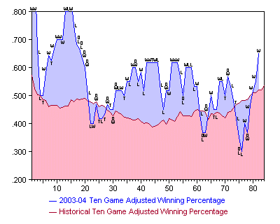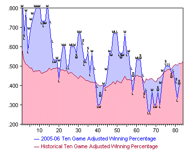 After a slow start in their first five games, the Canucks put together a string of good games which lasted past the midpoint of the season. Around games 50-60, the Canucks showed their classic form of fading. Then, they started moving back up during games 60-70. With the loss of players like Markus Naslund and Andrew Cassels, the Canucks failed to have a strong finish. They finished the season as it began -- below their historical average.