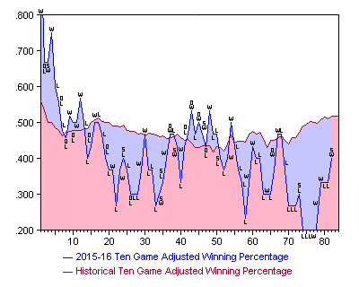 The Canucks started the season with a loss and struggled through October. In November, the Canucks went on a run where they earned at least a point in 11 of 12 straight games. They were consistent through December and into early January. Their annual swoon was a few games behind schedule, but by game 48, the Canucks were below their historical average. A four game winning streak pushed them above their historical average, but a late season collapse left the Canucks out of the playoffs.